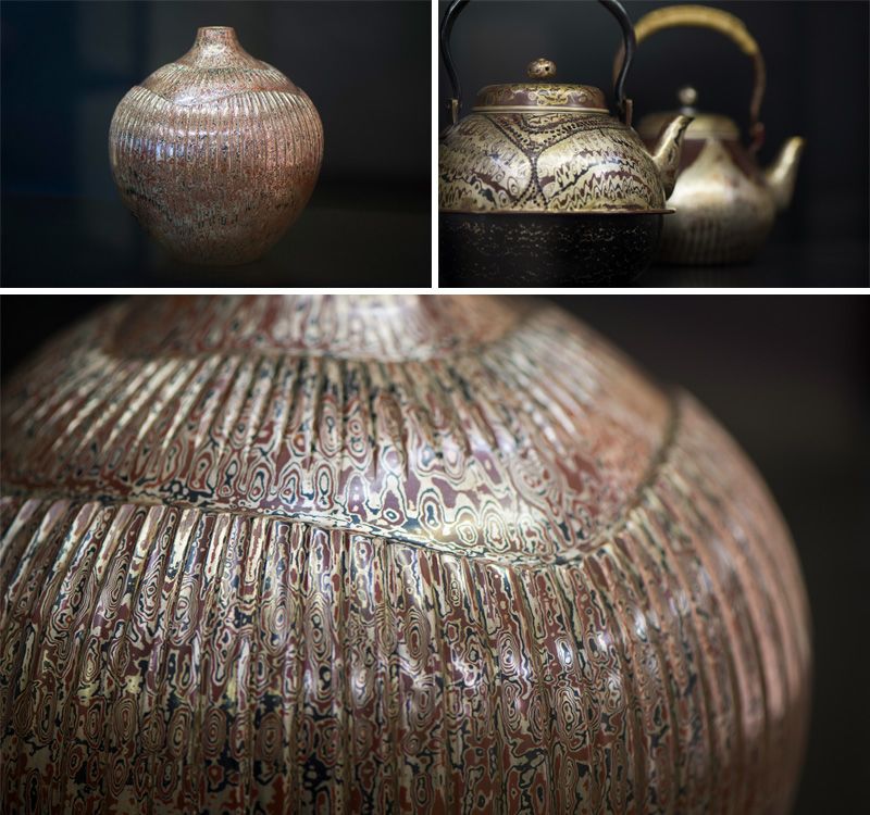 Arriba a la izquierda: Florero de mokumegane. Arriba a la derecha: Tetera de mokumegane. Abajo: Martillando la superficie de mokumegane se crea un diseño de capas más complejo que le añade refinamiento.