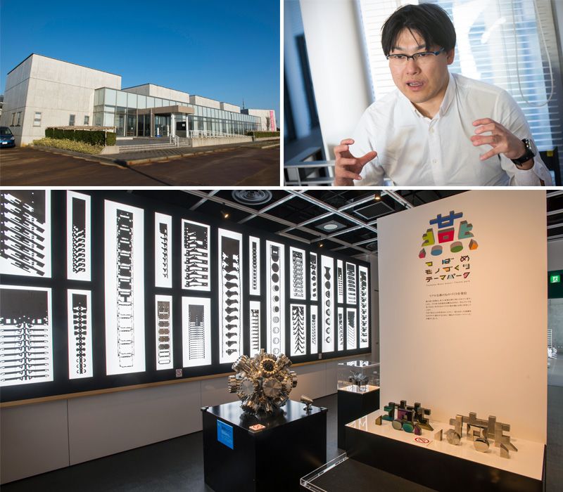 Arriba a la izquierda: Exterior del Museo de Historia Industrial de Tsubame. Arriba a la derecha: Saitō Yūsuke, curador principal del museo. Abajo: Sala de exposición del edificio nuevo.