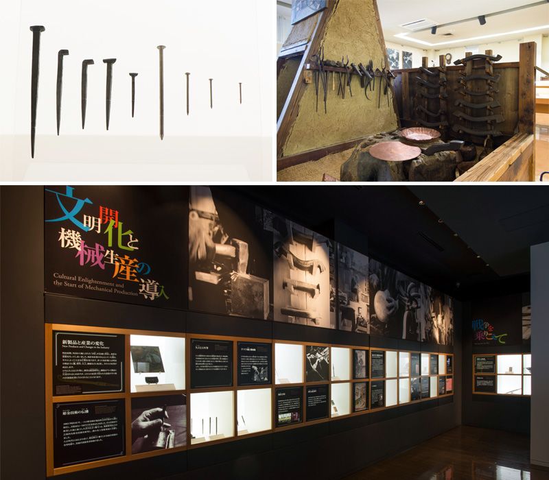Arriba a la izquierda: Los de la izquierda son clavos japoneses wakugi. Arriba a la derecha: Reproducción de una fábrica de artesanía del cobre. Abajo: La exposición del Museo de Historia Industrial de Tsubame ofrece una visión muy didáctica de la historia del sector del metal en la ciudad.
