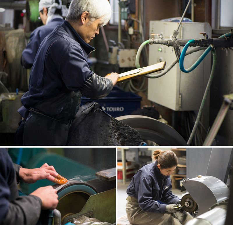 Arriba: Un artesano experto comprueba con cuidado el acabado de una cuchilla. Abajo a la izquierda: El proceso del afilado se repite varias veces. Abajo a la derecha: Una artesana pule la soldadura de una cuchilla.
