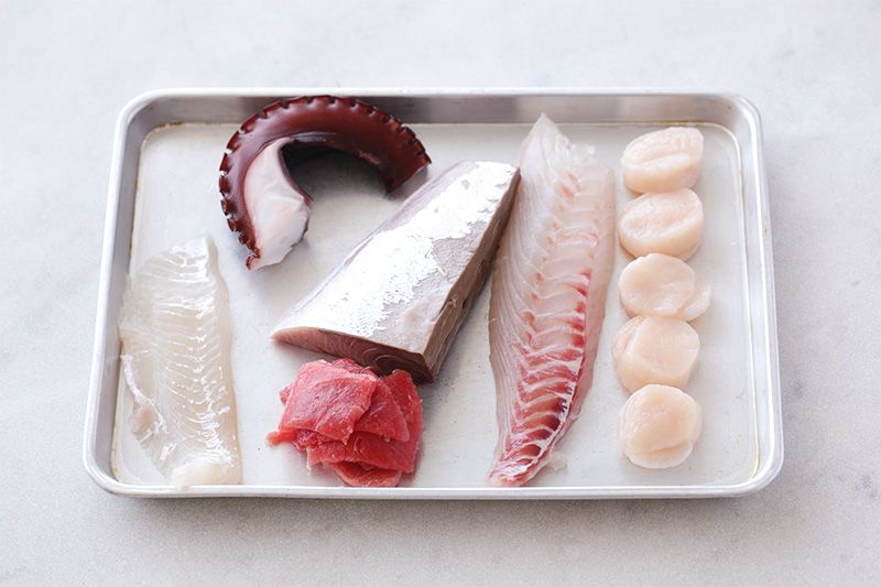 - Pescado o marisco crudos al gusto (atún, jurel, pulpo, vieras, dorada del Japón o pargo japonés, falso halibut del Japón…)