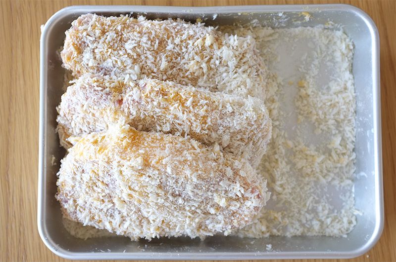 - Se retira, con un cuchillo o unas tijeras, la fina membrana que separa la carne de la grasa de esta, de modo que no se contraiga durante el freído. Si se hace con paletilla, se amasa suavemente con un rodillo de cocina o uslero. Se puede utilizar también carne de vacuno, pero en ese caso es necesario acortar el tiempo en la sartén.