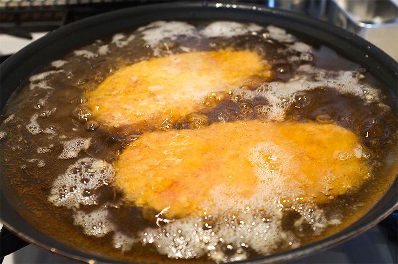 - Se echa el aceite en la sartén, hasta cubrir unos tres centímetros, y se calienta a 160 grados. La clave para determinar la temperatura adecuada reside en que se formen burbujas cuando el empanado de la carne entre en contacto con el aceite. Se fríe tres minutos, se le da la vuelta a la carne y se espera otros tres.