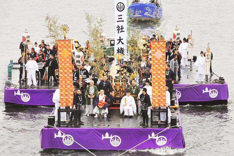 Celebración del funatogyo (cruzar el río en barco) por primera vez en 54 años. El barco que transporta el mikoshi cruza el río Sumida. (Imagen: santuario de Asakusa)
