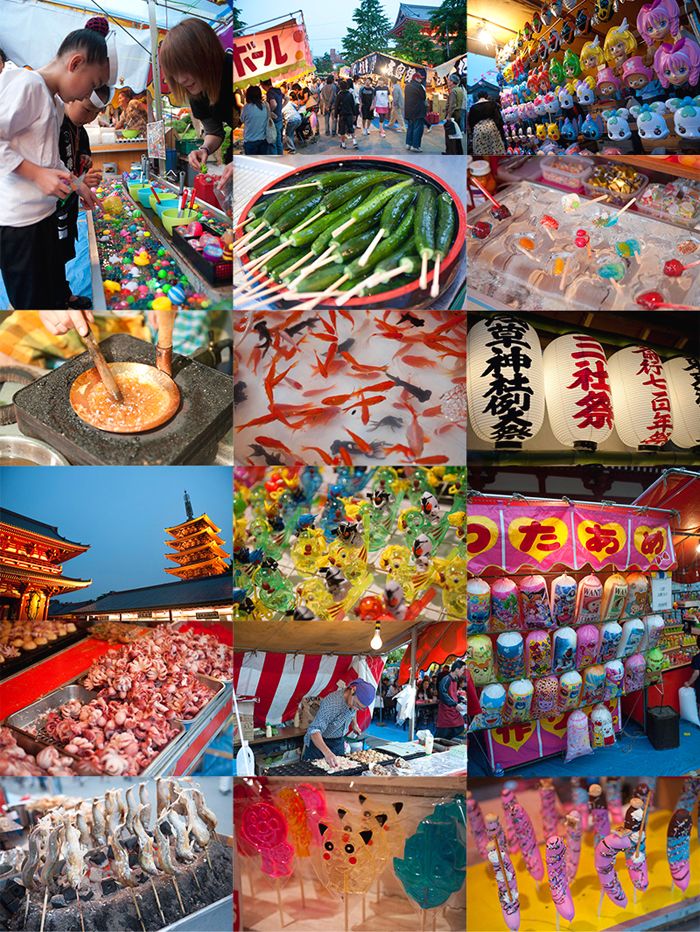 Otro aspecto disfrutable del festival son sus tenderetes nocturnos. Pesca de pececitos, takoyaki (bolas de masa con pulpo), algodón de azúcar, caramelos de albaricoque, plátanos con chocolate, máscaras... los puestos callejeros se agolpan dentro del recinto del templo Sensōji. Se pueden encontrar también pinchos morunos de pepino, o ayu (un tipo de pescado) asado con sal.