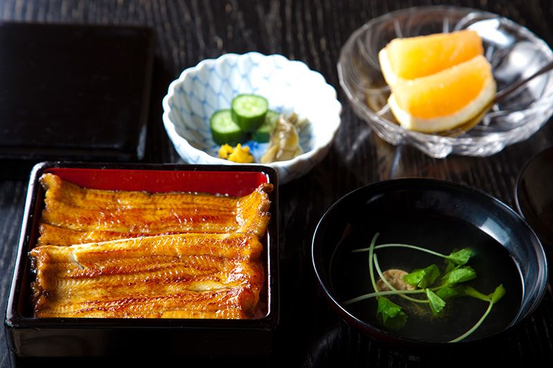 Unajū, anguila abierta y asada con salsa de soja kabayaki servida sobre arroz cocido en un recipiente lacado con forma de caja, desde 4.095 yenes. Comienzan a asar el pescado justo después de realizar la comanda, por lo que tardan unos treinta minutos en servirlo. Mientras se espera, se recomienda tomar como aperitivo sake y unas brochetas de vísceras de anguila (kimoyaki, 1.260 yenes), entre otros.