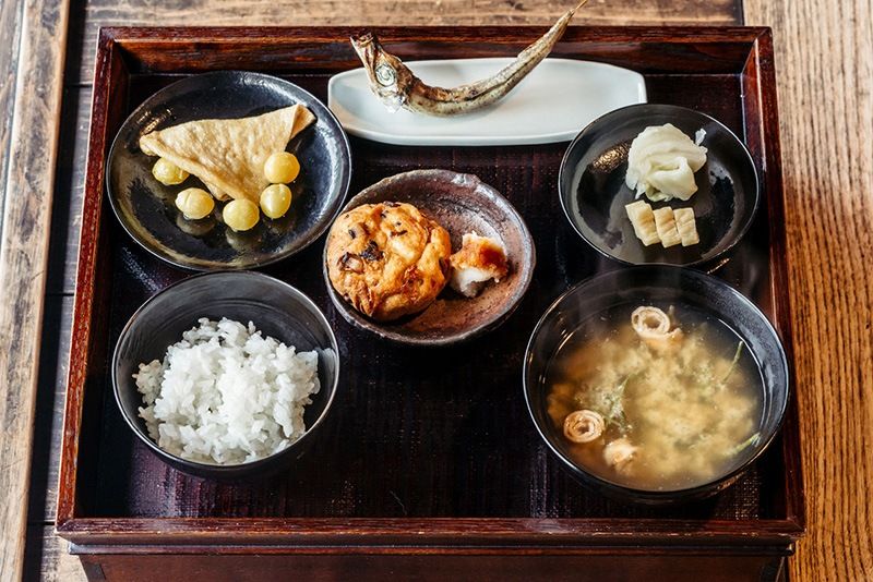 La comida que preparan los dueños –Sakamoto Shin’ichirō y la esposa de este, Mihoko– es uno de los motivos por los cuales la posada goza de tanto reconocimiento entre la clientela. El desayuno, que sigue la norma de la cocina japonesa según la cual un menú debe constar de una sopa y tres platos para acompañarla, está elaborado con ingredientes de la zona, entre ellos pescado, verduras y tofu, aprovechados al máximo.