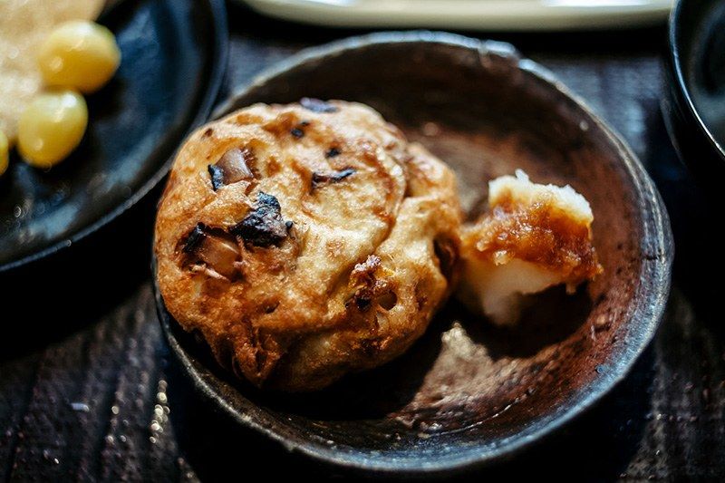 El ganmodoki casero de la posada Sakamoto es uno de los platos más representativos de su desayuno. Lo preparan mezclando el tofu, endurecido con agua de mar el día anterior, con lampazo o bardana y zanahoria triturados, y le ponen también setas shiitake y gambas sakura. La calidad del aceite determina el sabor.