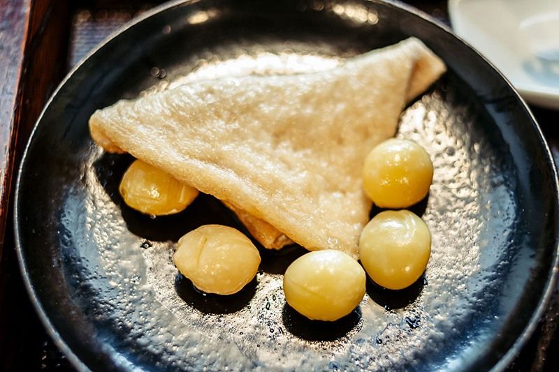 En la ciudad de Suzu hay una tienda especializada en queso de soja que gusta mucho al dueño de la posada, y es allí precisamente donde compra el tofu frito que sirve acompañado de semillas de ginko, que va cociendo durante medio día con boquerones secos y caldo dashi de alga konbu.