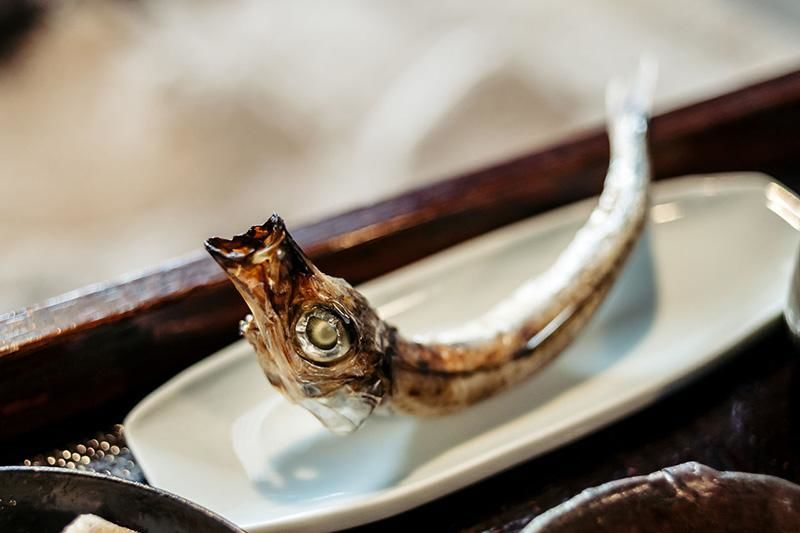 Sakamoto compra nigisu (glossanodon semifasciatus) pescado en Noto, donde se lo conoce como megisu, y lo seca él mismo. Las entrañas también son deliciosas, de ahí que sean muchas las personas que se lo comen entero preparado de esta forma.