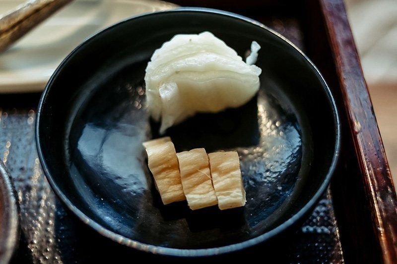 Se dice que incluir al menos un plato fermentado en todo menú que se precie contribuye a la digestión. En la posada Sakamoto se han decantado por takuan casero elaborado a finales de año y col china. Aunque estas verduras, recolectadas en las inmediaciones del establecimiento, no destacan precisamente por su sabor, le dan un toque tradicional al desayuno.