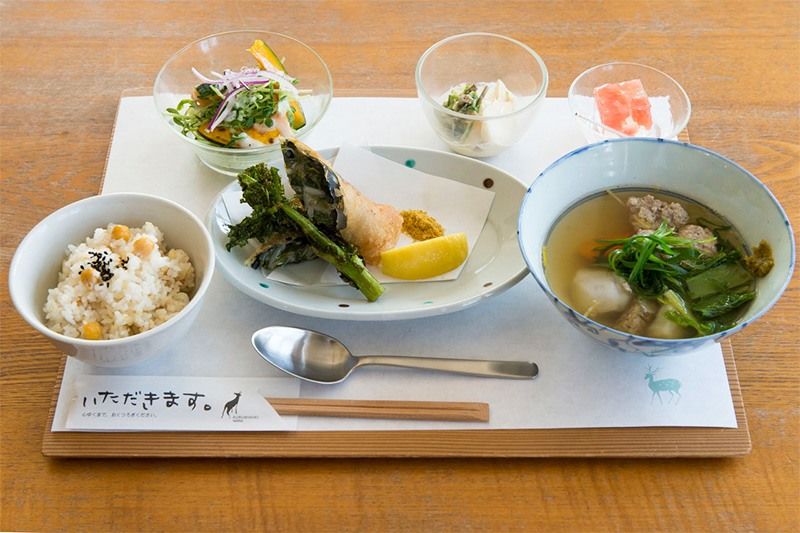 Además de los establecimientos que regenta, Ishimura se dedica a la promoción de diferentes negocios, algunos enfocados en la revitalización de las economías regionales. Machi no Shule 963, en su localidad natal, es uno de ellos. Otro ejemplo es Shika no Fune, una oficina de información turística en Nara. Todos ellos tienen en común algo: incorporan elementos de la naturaleza sin llegar a parecer forzados.ISHIMURA Shika no Fune es una oficina de turismo situada en una zona de Nara llena de casas antiguas, si bien cuenta con huertos y arrozales en los que cultivamos verduras y arroz. La combinación de una zona tan tradicional con el paisaje de los huertos y los arrozales sorprende. Algunos clientes dicen que es un lugar donde se respira tranquilidad, algo que me alegra y me da impulso para pensar en qué será lo próximo que plante.Saco fuerzas de mi deseo de contarle a la gente lo divertida que puede ser la vida diaria y todo lo que se puede hacer para que sea más creativa, tal y como me enseñó mi abuela. Siempre he admirado la manera en que ella era capaz de llevar a cabo las labores domésticas sin perder su aspecto pulcro. Otra cosa que me motiva a seguir es que quiero que mucha más gente conozca las maravillas de Nara, ese lugar que tanto me gusta.En Nara, tanto el té como el arroz y las verduras se elaboran con un cuidado tal que sorprende; su sabor es excelente. Además, los productos de artesanía y de uso diario son fáciles de usar. Tienen un aspecto refinado por naturaleza, pero hay algo en ellos que no los hace famosos. Eso me inspira ternura, pero también cierta pena. Esas impresiones se han convertido en la base de los platos que sirvo en Akishino no Mori y en Kurumi no Ki.Por ejemplo, tenemos verduras como la yamatomana (Brassica rapa L. oleifera) que sería el origen de la komatsuna o espinaca japonesa (Brassica rapa var. perviridis), pero más grande. Luego está una variedad de lampazo o bardana, el udakingobō, que crece en una tierra en la que hay mica y, por lo tanto, tiene una piel brillante. Ambos alimentos son muy poco comunes, de ahí que resulten interesantes. A la hora de prepararlos, se aprovecha su sabor sin florituras; sobresalen por sí solos en el recipiente y en la sala en los que se sirven. Lo que busco es que la gente se siga sorprendiendo cuando los llevo a la mesa, esa clase de hospitalidad.Kurumi no Ki