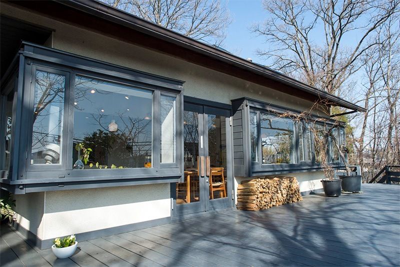 En los grandes ventanales del restaurante Nazuna se refleja el paisaje boscoso.