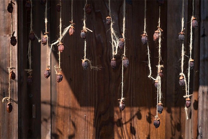 Caquis secándose al sol en el alero del almacén. Provienen del jardín del establecimiento.