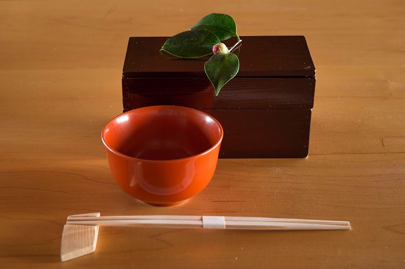 Cuenco y bentō de dos pisos, ambos lacados. La camelia de adorno, una wabisuke tsubaki, es una bella muestra del buen trato a los clientes.