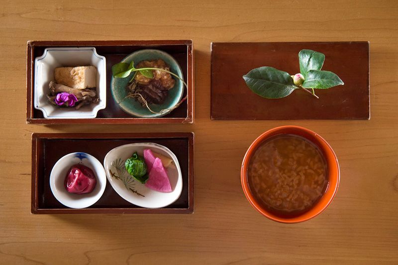 Las gachas de arroz se sirven acompañadas de diez ingredientes diferentes, entre encurtidos y miso, cuidadosamente elaborados.