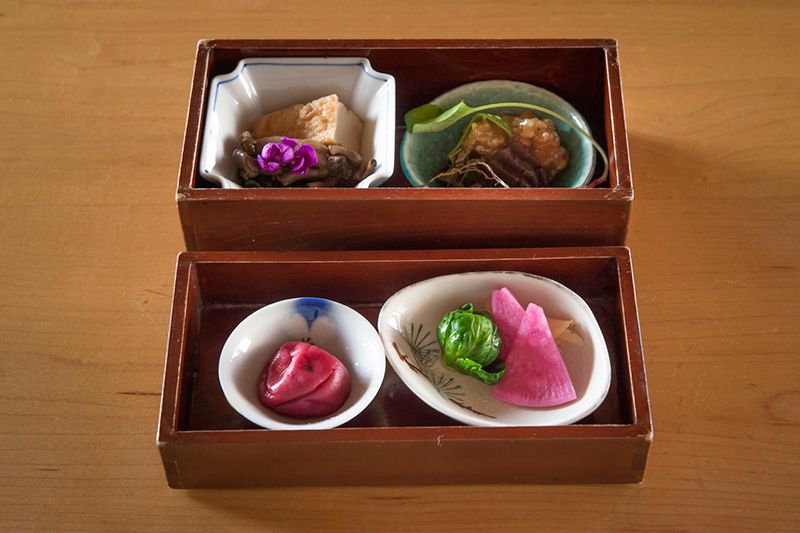 Las cajitas de comida para llevar que acompañan al arroz congée de té que Nakatani sirve como desayuno fueron heredadas por los residentes de la localidad junto con esa costumbre popular de antaño. Al quitarles la tapa, aparece ante nuestros ojos una serie de ingredientes locales elaborada con sumo cuidado. Se trata de un plato simple, pero en él quedan plasmados elementos imprescindibles de la gastronomía de Nara.