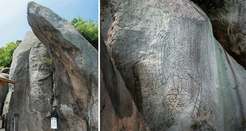 Las rocas Meoto, en el monte Senkōji, con una figura mitológica grabada en una de ellas.