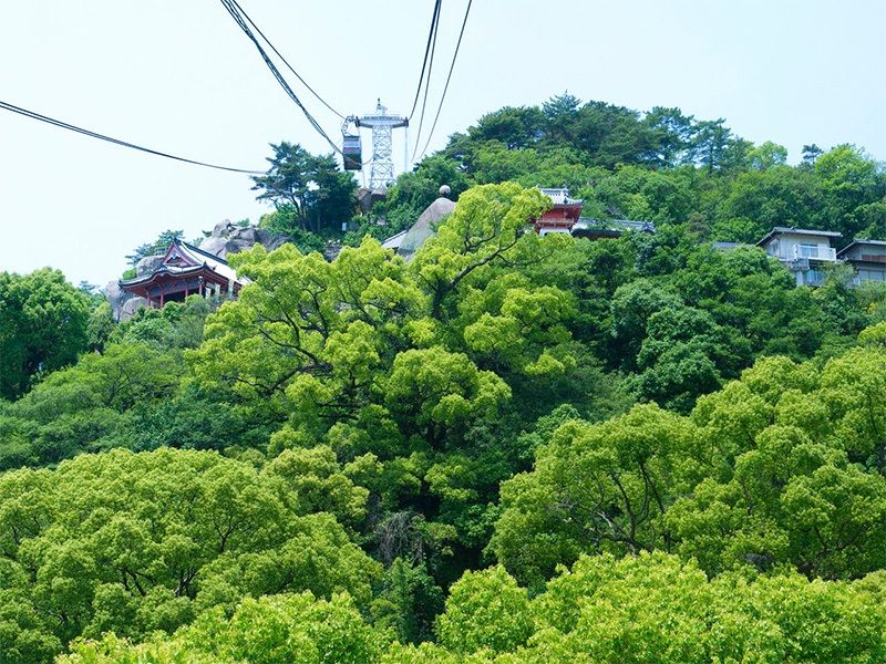 La ladera del monte Senkōji, con la Tama-no-iwa (roca Bola) visible entre el arbolado, vista desde la cabina del teleférico.