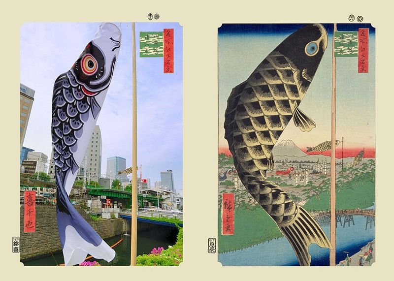 Para tomar la foto, me levanté temprano un día festivo de principios de mayo y me planté en Suidōbashi con una bandera de carpa. Tuve que hacer casi cuatrocientos disparos para lograr encuadrar el puente en la misma posición y captar la bandera con la misma ondulación que en el cuadro. Los que me vieron luchando desesperadamente con el viento aquel día debieron de preguntarse qué pretendía hacer.