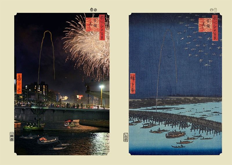 Tomé la foto durante el Festival de Fuegos Artificiales del río Sumida, desde la parte baja del río, con el puente de Ryōgoku en el medio. Los fuegos quedaban tan lejos que no tuve más remedio que enfocarlos con un objetivo telescópico e incluir el puente en el encuadre. Eso me impidió abarcar todo el largo del puente como en el cuadro, pero a cambio capté al público contemplando el espectáculo con fascinación. A pesar de que los fuegos actuales son muy coloridos, elegí una fotografía en que aparecía un cohete simple como los del antiguo Edo.