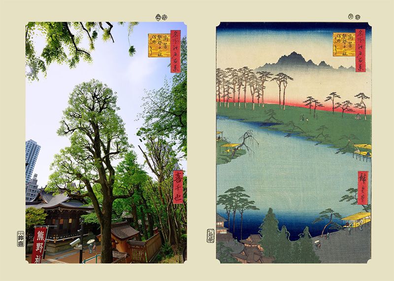 Sabiendo que el cuadro de Hiroshige ilustra el paisaje visto desde donde ahora está el edificio Eco Gallery Shinjuku —dentro del Parque Central de Shinjuku—, pedí permiso para tomar fotografías desde allí. Por desgracia, los generosos árboles del parque ocultaban completamente el santuario, por lo que al final decidí enfocarlo desde cerca y situarlo en el extremo inferior izquierdo de la fotografía.