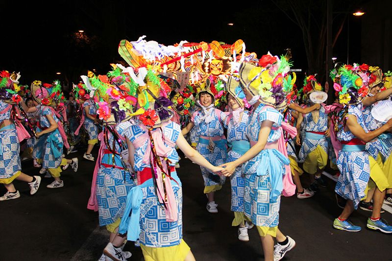 El festival cobra vida al sonido de los cánticos “Rasse ra!” y los saltos y contorsiones de los bailarines haneto, vestidos con brillantes colores. Cada carroza lleva a su alrededor un grupo de entre 500 y 1.000 (a veces incluso 2.000) bailarines haneto, que danzan salvajemente. Los bailarines llevan yukata y hanagata, un sombrero de paja, decorado con flores, además de sandalias de paja en los pies. Cualquiera que desee participar puede alquilar un traje de haneto e incluso pedir ayuda para ponérselo. El traje nos otorga derecho a unirnos a la diversión, y saltar y bailar cuanto deseemos.