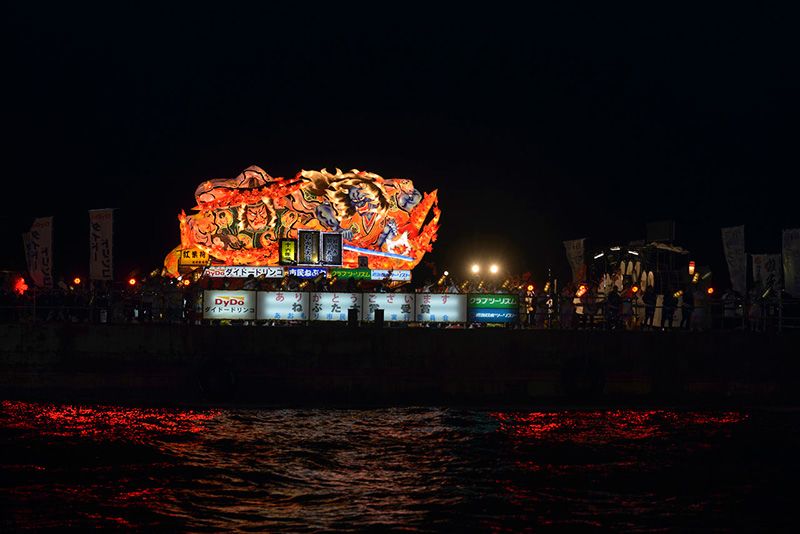 Durante el gran final las carrozas mejor valoradas se cargan en barcas para realizar un desfile por las aguas de la bahía. (© Asociación de Turismo y Convenciones de Aomori)