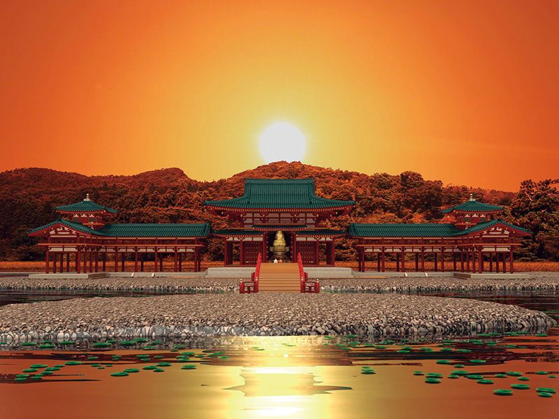 Una recreación generada por gráficos computerizados de los sitios Patrimonio de la Humanidad de Muryōkōin y el monte Kinkei, tal como se hubieran visto en los albores de Hiraizumi. (© Panel Educativo de Hiraizumi)