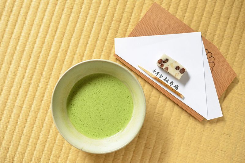 El visitante se puede tomar un respiro mientras se toma un cuenco de té verde y un dulce japonés.