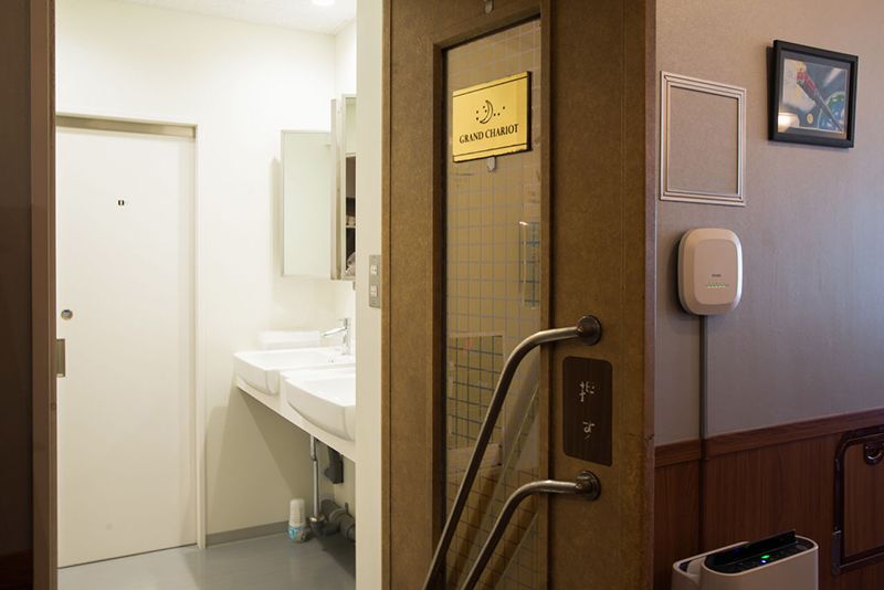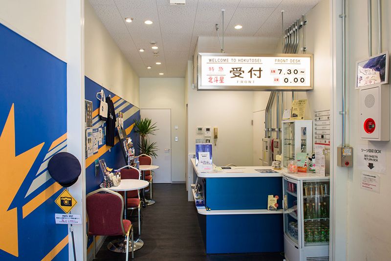 El indicador de destino del tren es reutilizado en la recepción. La pared de la izquierda reproduce los motivos decorativos de los coches del Hokutosei y es un telón de fondo popular para las fotos.