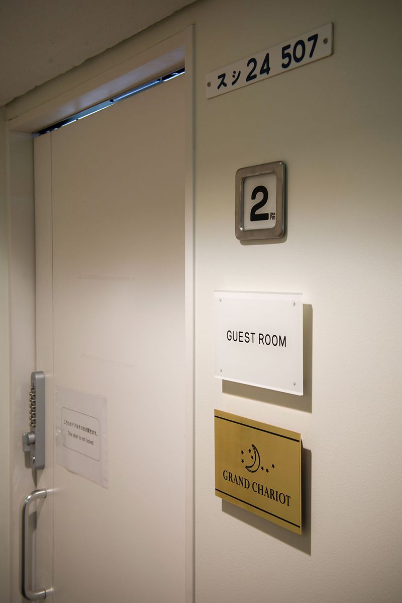 Al abrir la puerta al lado de las placas con el número de piso, que eran las del número de coche, y entrar en la habitación, están alineadas las literas utilizadas en el coche dormitorio de clase B del Hokutosei. Al lado de la ventana hay un escritorio y una silla de la habitación doble deluxe del coche dormitorio de clase A.