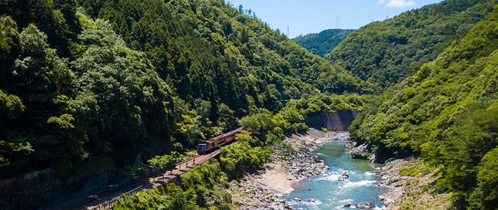 Los antiguos vagones de mercancías de Sagano “Torokko”, también conocido como el Tren Romántico, hacen un recorrido de 25 minutos junto al río Hozu, cuyas aguas se convierten en el río Katsura que pasa por debajo del puente Togetsu. Utilizando las vías de una línea de la JR del oeste hoy en desuso, este nostálgico tren de motor diésel circula entre las estaciones de Torokko Saga y Torokko Kameoka, ofreciendo unas vistas cercanas al paisaje de la ribera del río con sus cerezos en flor en la primavera, su verde follaje en verano, el cambiante color de sus hojas en otoño y un panorama de nieve en invierno.
