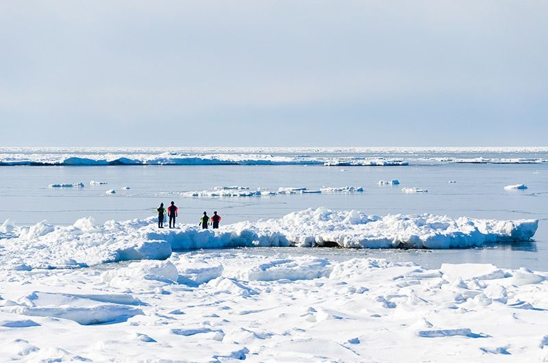 Hielo a la deriva en el parque de flores silvestres de Ikushina. Si bien es seguro caminar sobre los témpanos amontonados en tierra firme, no siempre es fácil saber dónde termina la tierra y comienza el océano bajo el hielo.