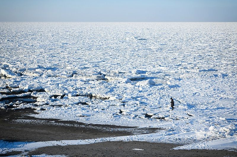 La vista desde el cabo Puyuni, donde las aguas del distrito de Utoro están cubiertas de hielo a la deriva.