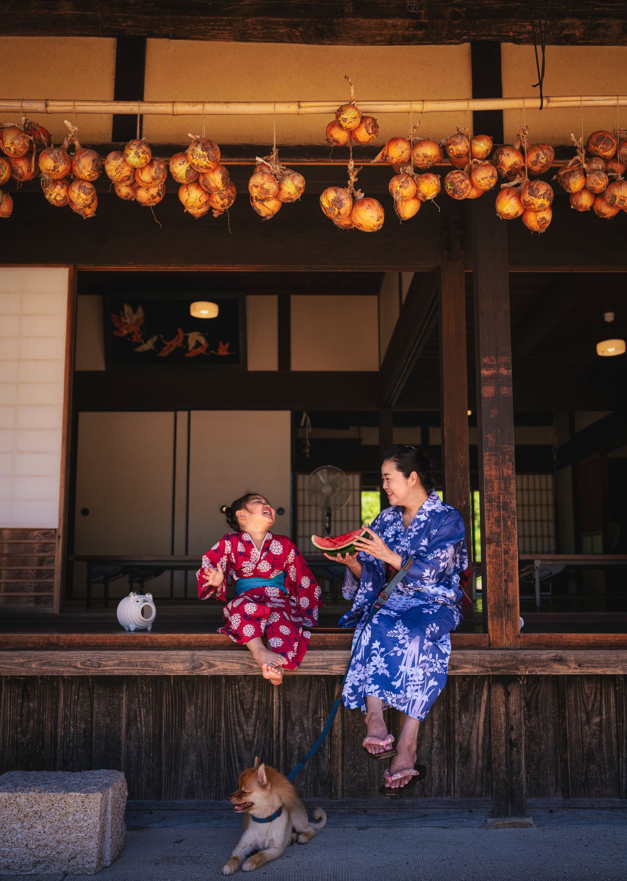 Yamada Shinji : Cela me rappelle mon enfance en été chez mes grands-parents maternels, quand nous dégustions tous ensemble des pastèques assis devant la maison. Cette image est proche de la perfection, que ce soit le cadre et l’atmosphère, les expressions naturelles de la mère et sa fille, l’équilibre des couleurs de leur yukata, le chien Shiba se reposant paisiblement à leurs pieds, la disposition des encens contre les moustiques et des oignons pendus sous l’avant-toit.