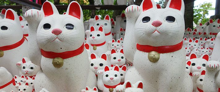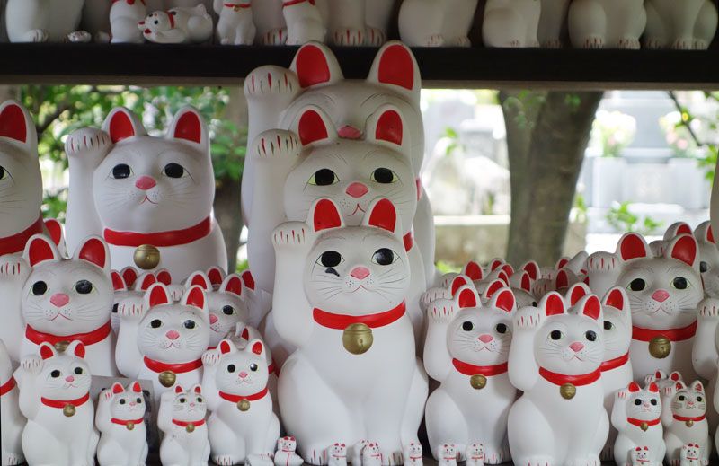 Cet attroupement félin se trouve à Gôtoku-ji, un temple de Setagaya à Tokyo. Selon la légende, un seigneur féodal du XVIIe siècle du domaine de Hikone (aujourd’hui une partie de la préfecture de Shiga) passait par là lorsqu’un chat apparut et l’invita dans le temple. Le seigneur fut ravi d’avoir accepté l’invitation puisqu’il se mit à pleuvoir des trombes et qu’il lui fut ainsi épargné de se retrouver trempé jusqu’aux os. En remerciement, il fit de nombreuses offrandes et choisit le temple où il avait trouvé refuge comme temple officiel de sa famille.