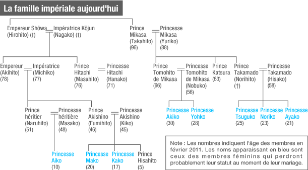 Aujourd'hui, la Loi de la maison impériale stipule que tous les enfants nés au sein de la famille impériale en sont membres de manière permanente. Le mariage des membre mâles doit être approuvé par le Conseil de la maison impériale, dans lequel figurent deux membres de la famille impériale, ainsi les dirigeants des trois branches du pouvoir – les présidents des deux chambres du parlement, le Premier ministre, et le président de la cour suprême japonaise. Une fois que ce Conseil approuve le mariage, l'épouse devient elle-même membre de la famille impériale. Les mariages de membres féminins n'ont cependant pas à être approuvés par ce Conseil. Dans l'état actuel des choses, il est par conséquent impossible d'empêcher que ces femmes cessent d'appartenir à la famille impériale une fois qu'elles sont adultes et se marient.