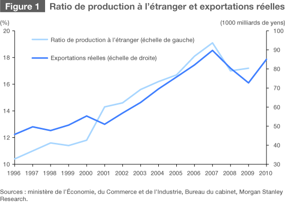 Un certain nombre de facteurs se conjuguent pour rendre improbable l’apparition d’un déficit du compte courant. En premier lieu vient la bonne santé tenace des exportations japonaises, qui dément l’hypothèse selon laquelle elles pourraient décliner suite aux transferts de fabrication outre-mer en réaction à l’élévation du taux de change du yen. Cette heureuse issue est le fruit de la force des biens d’équipement et des produits semi-finis japonais, ainsi que de la proximité de ses voisins asiatiques. Certes les transferts de production à l’étranger s’accélèrent depuis un certain temps, mais les statistiques montrent que, dans le même temps, les exportations japonaises ont continué de progresser (figure 1).