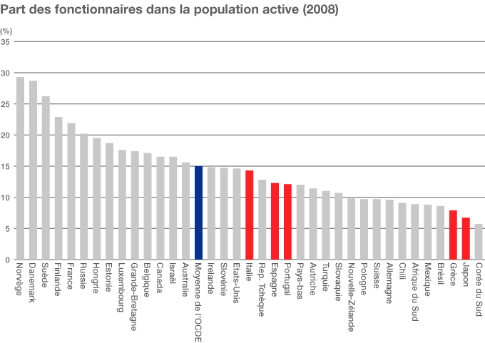 La part des fonctionnaires dans la population active des quatre pays étudiés est supérieure aux 6,7% du Japon, mais inférieure à la moyenne de 15% dans les nations de l’OCDE (entre 2000 et 2008). Elle s’établit à 14,3% en Italie, le plus haut niveau, 12,3% en Espagne, 12,1% au Portugal et 7,9% en Grèce (OCDE 2011). Cependant, l’examen du détail de ces chiffres montre une mauvaise mise en valeur des ressources humaines.
