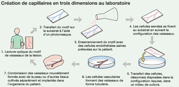 Pour la composition des motifs capillaires, les chercheurs de Dai Nippon ont eu l’idée de se servir d’un composé appelé polyéthylèneglycol (PEG). Les cellules n’adhèrent pas au PEG, ce qui en fait un matériau idéal pour cet usage. Le motif formé est une feuille plate, mais quand on le transfère sur un médium de cellules vasculaires de culture, celles-ci se développent en tubes autour du motif, créant ainsi des vaisseaux en trois dimensions. Le schéma ci-dessous montre comment ce procédé permet de créer des vaisseaux sanguins artificiels destinés à être implantés dans le corps d’un patient.