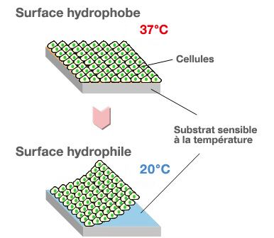 La surface, hydrophobe à 37°C, devient hydrophile à 20°C, ce qui permet l’enlèvement des cellules intégralement préservées sous leur forme de feuille.