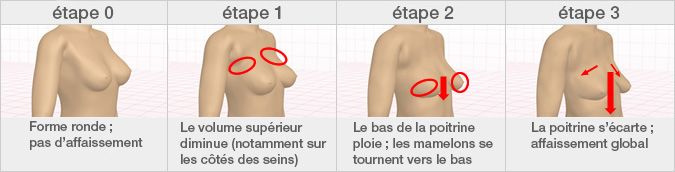 Modification de la poitrine avec l’âge. Au-delà de la vingtaine, la poitrine commence à s’affaisser, certaines femmes peuvent se trouver à l’étape 2 déjà avant 30ans.