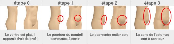 Modification de la forme du ventre avec l’âge. Le processus s’enclenche à un âge différent selon les femmes, certaines peuvent être à l’étape 0 à la quarantaine.