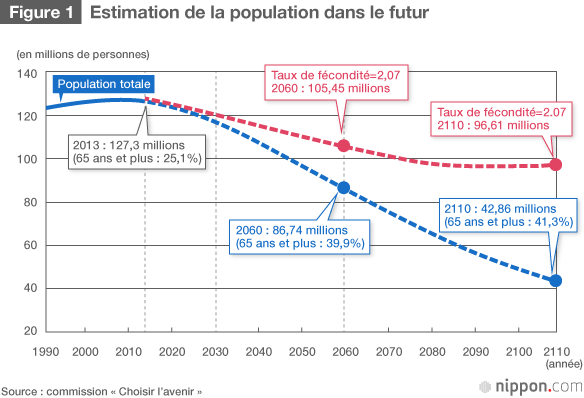 La commission « Choisir l’avenir », un groupe d’experts créé par le Conseil en stratégie économique et fiscale du gouvernement, sous l’autorité de Mimura Akio, président de la Chambre de commerce et d’industrie, estime dans son rapport provisoire publié en mai que la population du pays va continuer à décliner pendant les cinquante prochaines années ; si le taux de fécondité reste inchangé, le nombre total d’habitants en 2060 s’établira approximativement à 87 millions, soit deux tiers du chiffre actuel. En outre, avec 40% de la population âgée de plus de 65 ans, une proportion sans précédent, le Japon deviendra une société super-vieillissante.