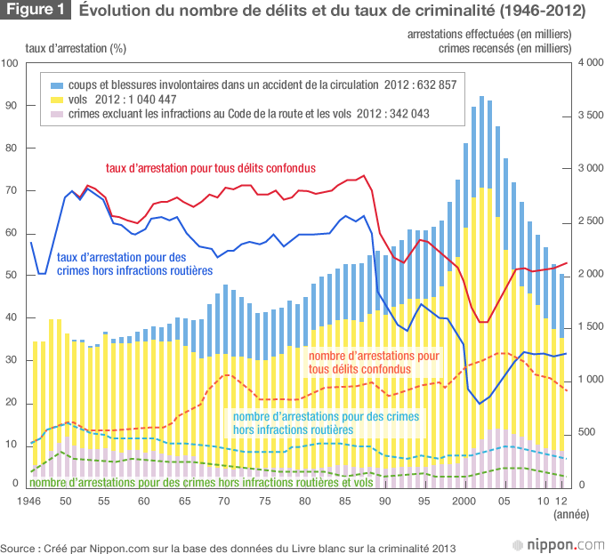 Selon le Livre blanc sur la criminalité publié par le ministère de la Justice, le nombre d’infractions au Code pénal a enregistré une nouvelle baisse en 2013 pour la 11e année consécutive avec 1 917 929 cas. Ce chiffre a commencé à diminuer en 2003, après avoir atteint 2 854 061 cas en 2002, son plus haut niveau depuis la fin de la Seconde Guerre mondiale. Cette baisse peut s’expliquer par une nette dimunition des vols qui représentaient la majorité des délits.