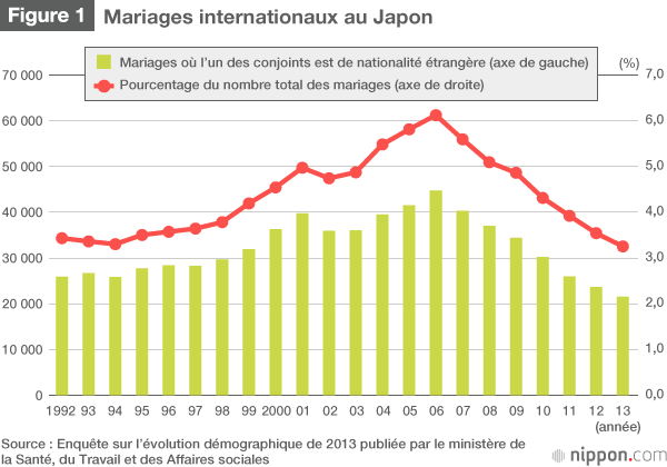 Selon les statistiques du ministère de la Santé, du Travail et des Affaires sociales, sur 21 488 des 660 613 mariages enregistrés au Japon en 2013, l’un des conjoints était de nationalité étrangère, soit un taux de 1 pour 30 couples. Si, en termes de pourcentage, ces unions ne représentent toujours qu’une faible part, elles ont néanmoins largement augmenté durant les 50 dernières années. Alors qu’en 1965 les mariages mixtes concernaient seulement 4156 couples, le phénomène s’est amplifié durant les décennies suivantes pour franchir la barre des 20 000 à la fin des années 80, et celle des 30 000 en 1999. Ce nombre a culminé en 2006, avec 44 701 unions mixtes, avant d’entamer une chute vertigineuse les années suivantes ; il a diminué environ de moitié, à un peu plus de 20 000 en 2011, une tendance à la baisse qui semble se poursuivre.