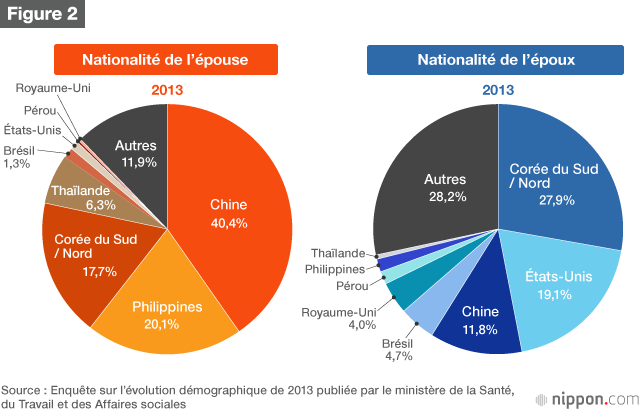 En 2013, 15 442 mariages internationaux concernaient un Japonais et une femme d’une autre nationalité, tandis que 6 046 liaient une Japonaise à un étranger. La majorité des épouses étrangères étaient originaires de pays asiatiques voisins, Chine en tête avec 6 253 femmes soit un pourcentage de 40,4% du total. Suivent les Philippines avec 3 118 épouses, et la Corée du Sud avec 2 734.