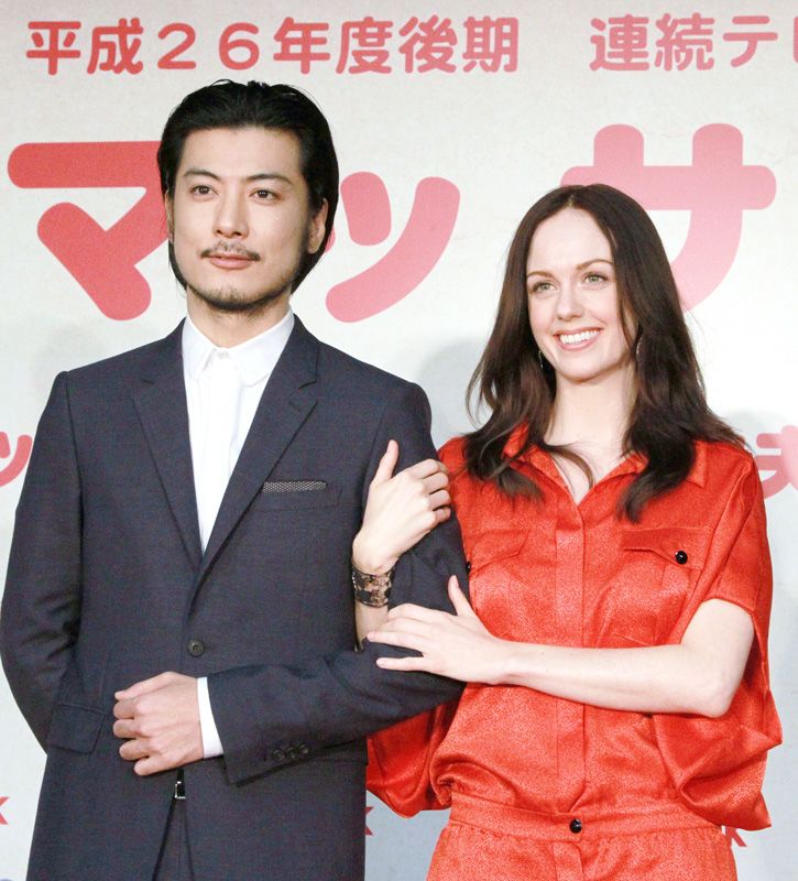 Les vedettes de Massan, la série matinale de la NHK : Tamayama Tetsuji interprète le producteur de whisky Kameyama Masaharu et l’actrice américaine Charlotte Kate Fox joue celui de sa femme écossaise, Ellie. (Jiji press)
