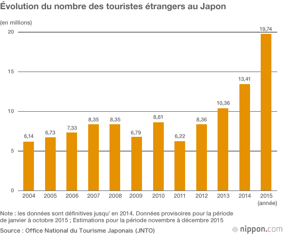 Selon l’Agence japonaise du Tourisme, les visiteurs étrangers ayant séjourné au Japon en 2015 a augmenté de 47,1 % par rapport l’année précédente, établissant un nouveau record pour la troisième année consécutive à 19 737 000 personnes. C’est la première fois depuis 1970 et l’Exposition universelle d’Osaka que le nombre de visiteurs entrants est supérieur au nombre de Japonais voyageant à l’étranger, qui, lui, s’est établit l'année dernière à 16 212 100 personnes, soit une baisse de 4 % par rapport à 2014. La balance des paiements dus aux voyages internationaux est d’ores et déjà en excédent de plus de 1 000 milliards de yens pour la période de janvier à novembre 2015.